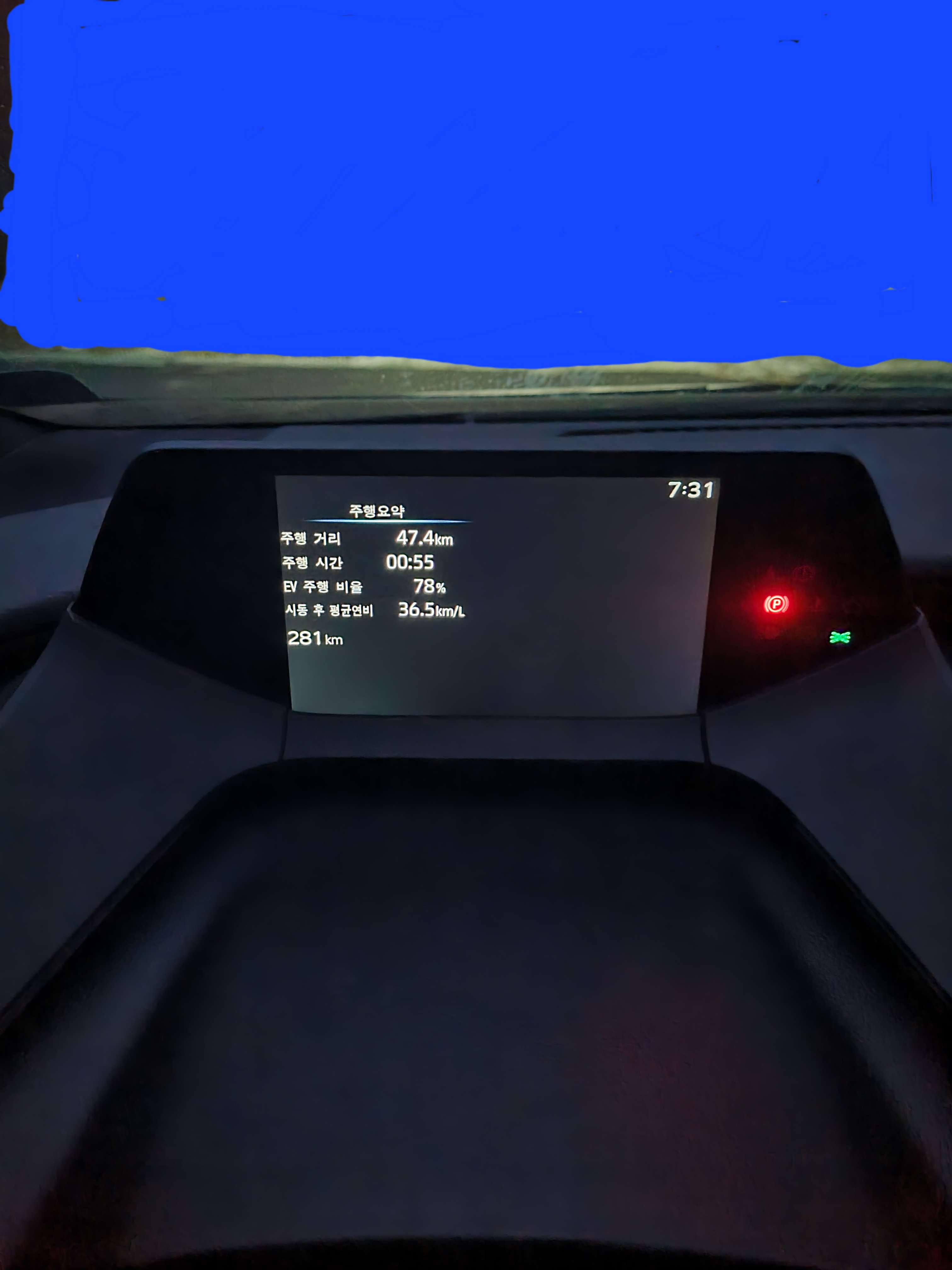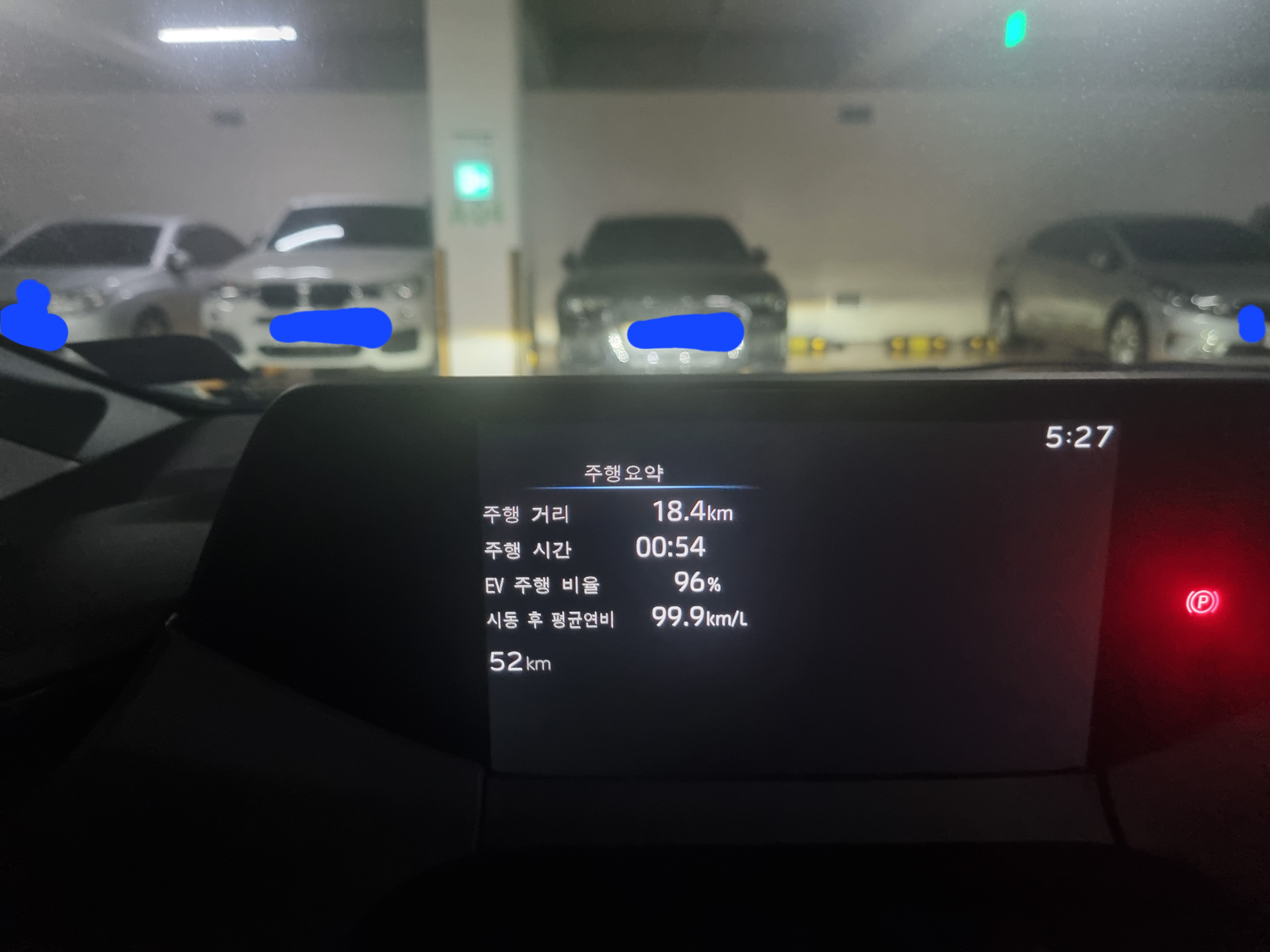 사용자 설정에 따라 리셋 이후, 연료 주입 이후, 시동 이후로 연비 정보를 바꿀 수 있다. 위 사진은 필자의 출근 후 연비를 보여준다. 속도는 80~120km/h 사이였었고 무리한 가속은 하지 않았다. 고속도로에서만 HV모드를 사용했고 톨게이트 전과 후에는 EV모드로 운행하였다.